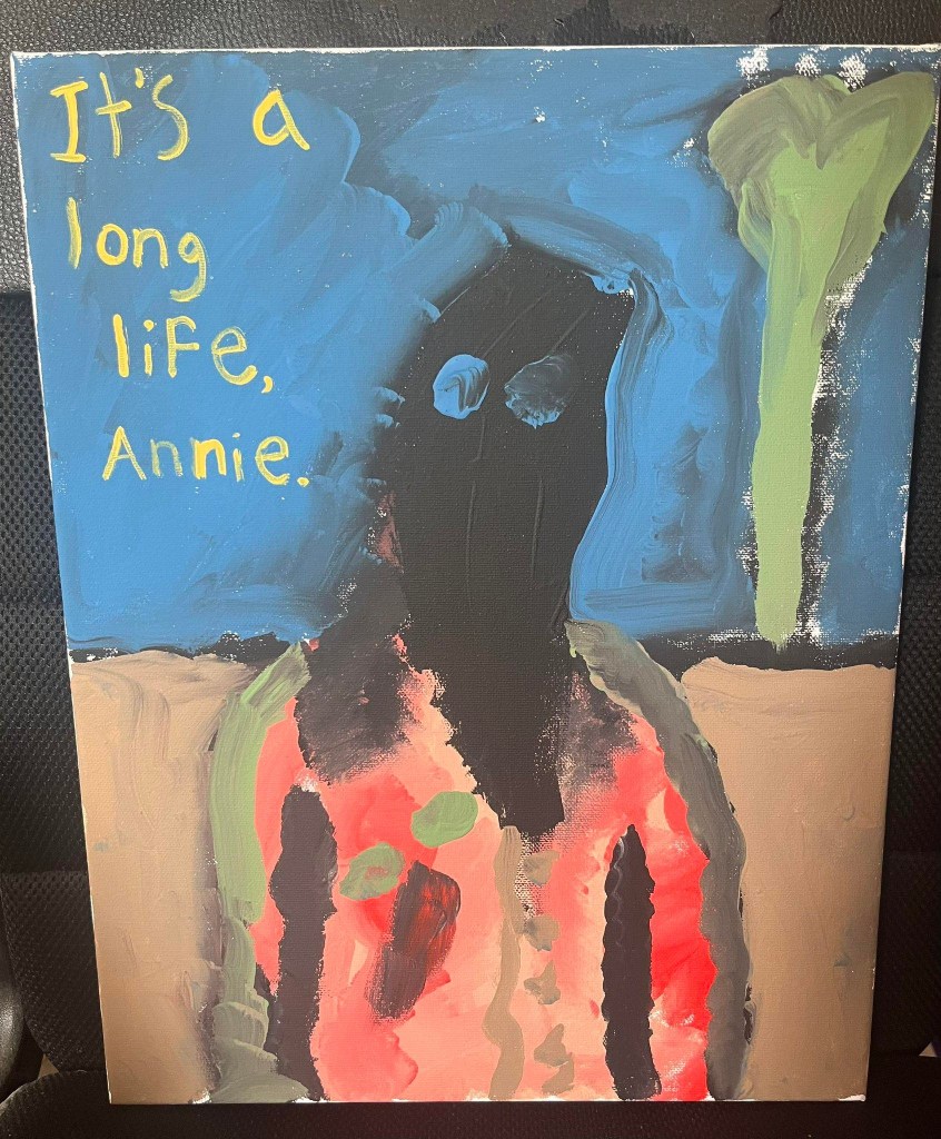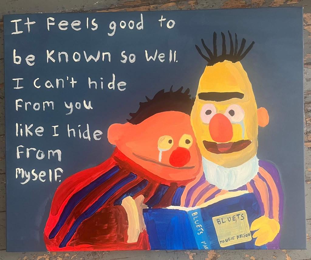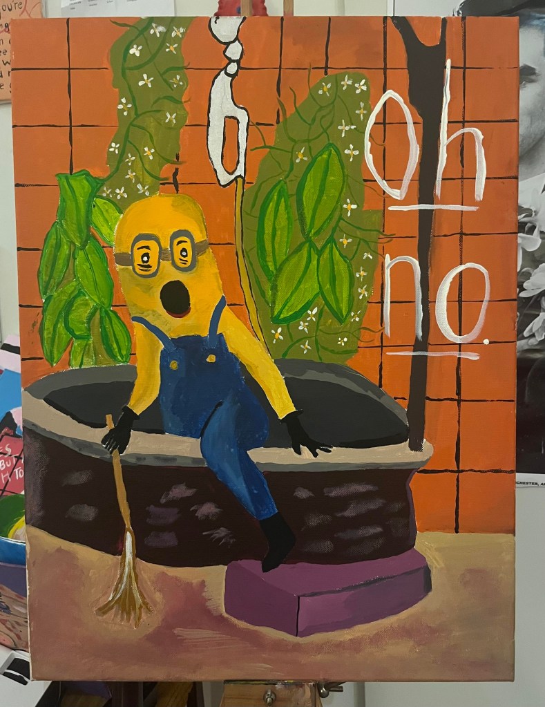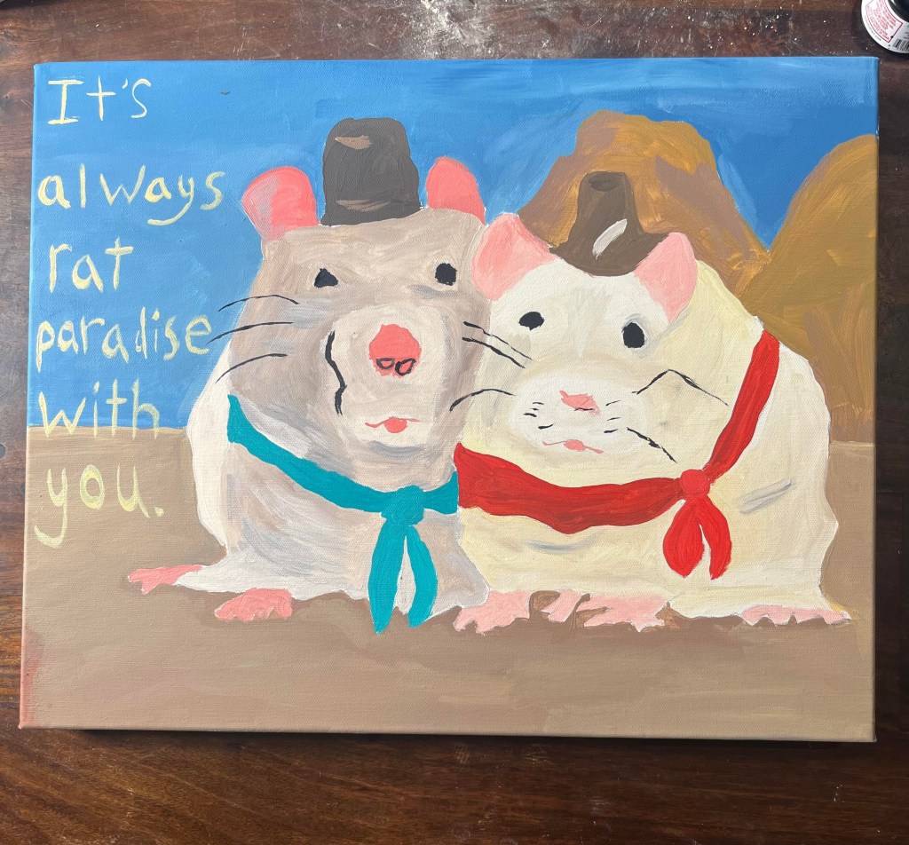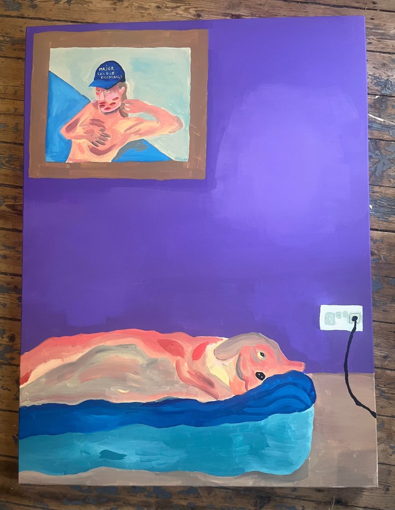 My paintings combine pop culture references, portraits of animals and famous faces, with text. My painting influences are David Hockney, Joan Brown, Cecily Brown, and John Currin.